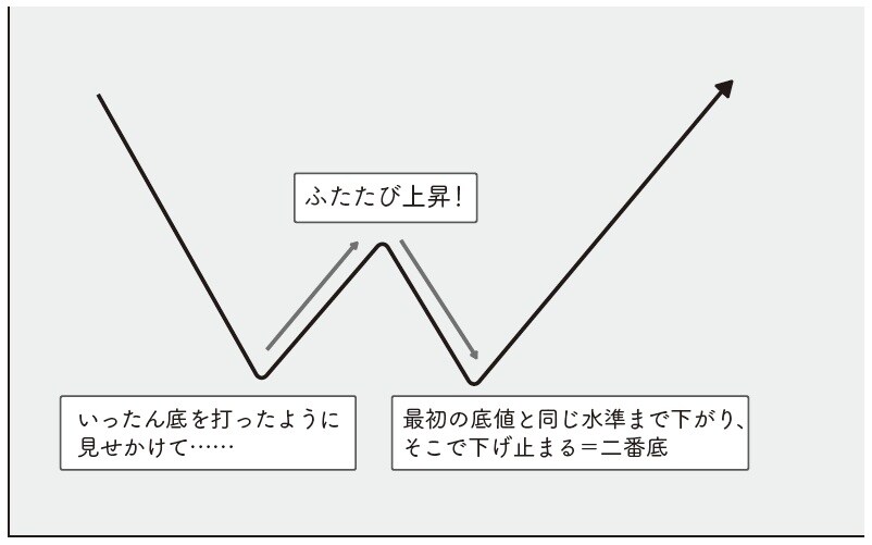 しかし、これは判断が難しいものでもあります。逃げた方がよいのか、すでに底値だから反発を待った方がよいのか。底値を打ったように見せかけて、再び下がる二番底という動きもあります。いったん下げ止まり、少し反発してから、また大きく下がるものです。最初の底値と同じ水準まで下がると、二番底が形成され、その地点で下げ止まるのがよくあるチャートの動きです。
