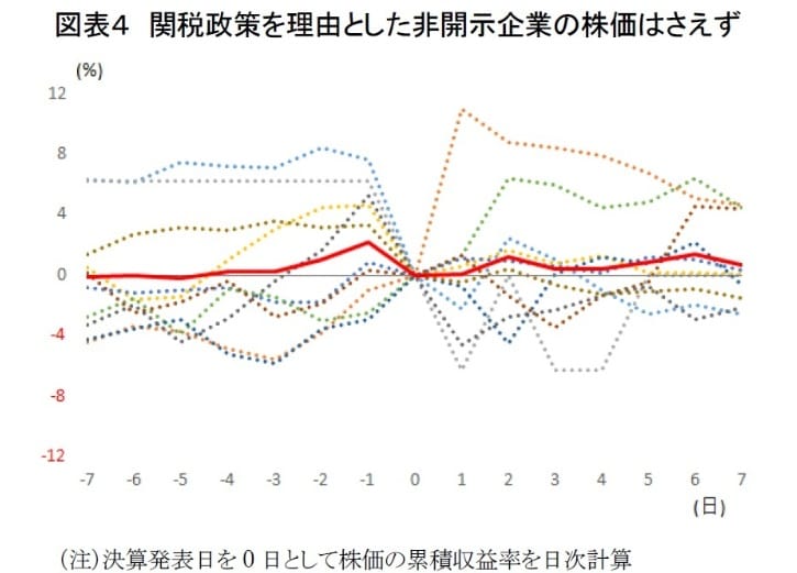業績見通しを非開示とした企業は68社と全体の5%を占めた。このうち、前期には業績見通しを開示していたが今期は非開示に転じた企業は28社(図表3④)あった。この28社のうち、米国の関税政策による先行き不透明感を理由に非開示とした企業は10社(鉄鋼1社、電気機器5社、輸送用機器4社)である。残る18社については、経営統合や完全子会社化による上場廃止予定など個別要因によるものだった。そこで、関税政策を理由に非開示とした10社について、決算発表日前後の株価推移を集計した(図表4)。図表中の点線は各社の株価推移、赤線は10社の株価の累積収益率を単純平均したものである。