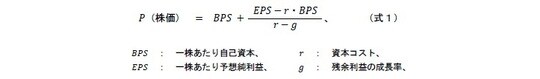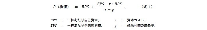 を変形したPERの逆数とPBRの逆数の関係式(式2)から、資本コストと成長率を同時推計した: