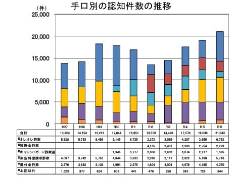 詐欺の手口もさまざまです。オレオレ詐欺、預貯金詐欺及びキャッシュカード詐欺盗(以下3類型を合わせて「オレオレ型特殊詐欺」という)の認知件数は1万413件、被害額は502.2億円で、総認知件数に占める割合は5割に迫っています。ほかにも還付金詐欺、架空料金請求詐欺、パソコンのウイルス除去のサポート名目で電子マネー等をだまし取るサポート名目詐欺、といったものもあります。