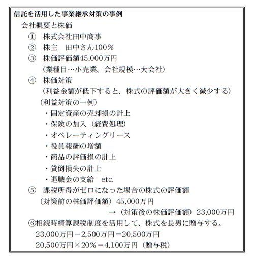 利益対策を行って、利益が下がった時点で、後継者に株式を贈与します。相続時精算課税制度を活用した場合、贈与税が4,100万円生じることになります。株式の贈与に際しては、信託を設定することにより、引き続き田中さん(受託者)が議決権を保有することが可能となります。
