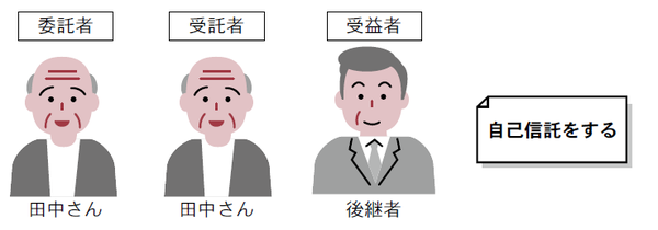 具体的には、会社の株式を信託します。委託者(管理を依頼する人)は、株式を所有している田中さんですが、田中さんが受託者(預かって管理する人)にもなることで、会社を経営する議決権は田中さんが持っておくことができます。つまり、田中さんが自分自身に、会社の株式を預けたことになります。田中さんが、株式を預かっているので田中さんが会社を経営し、議決権を持つことになるのです。