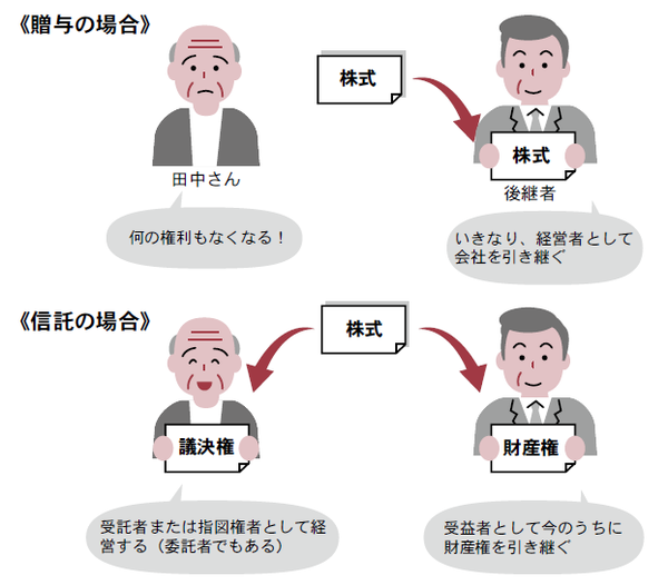 また、一般社団法人や信託会社、顧問税理士など、田中さん以外を受託者とする場合にも、田中さんに受託者に対する指図権(議決権などの行使を指図する権利)を与えておくことで、同じように田中さんが会社の経営を担うことができます。なお、会社の株主名簿には、株主として受託者である田中さんの名義で登録されます。