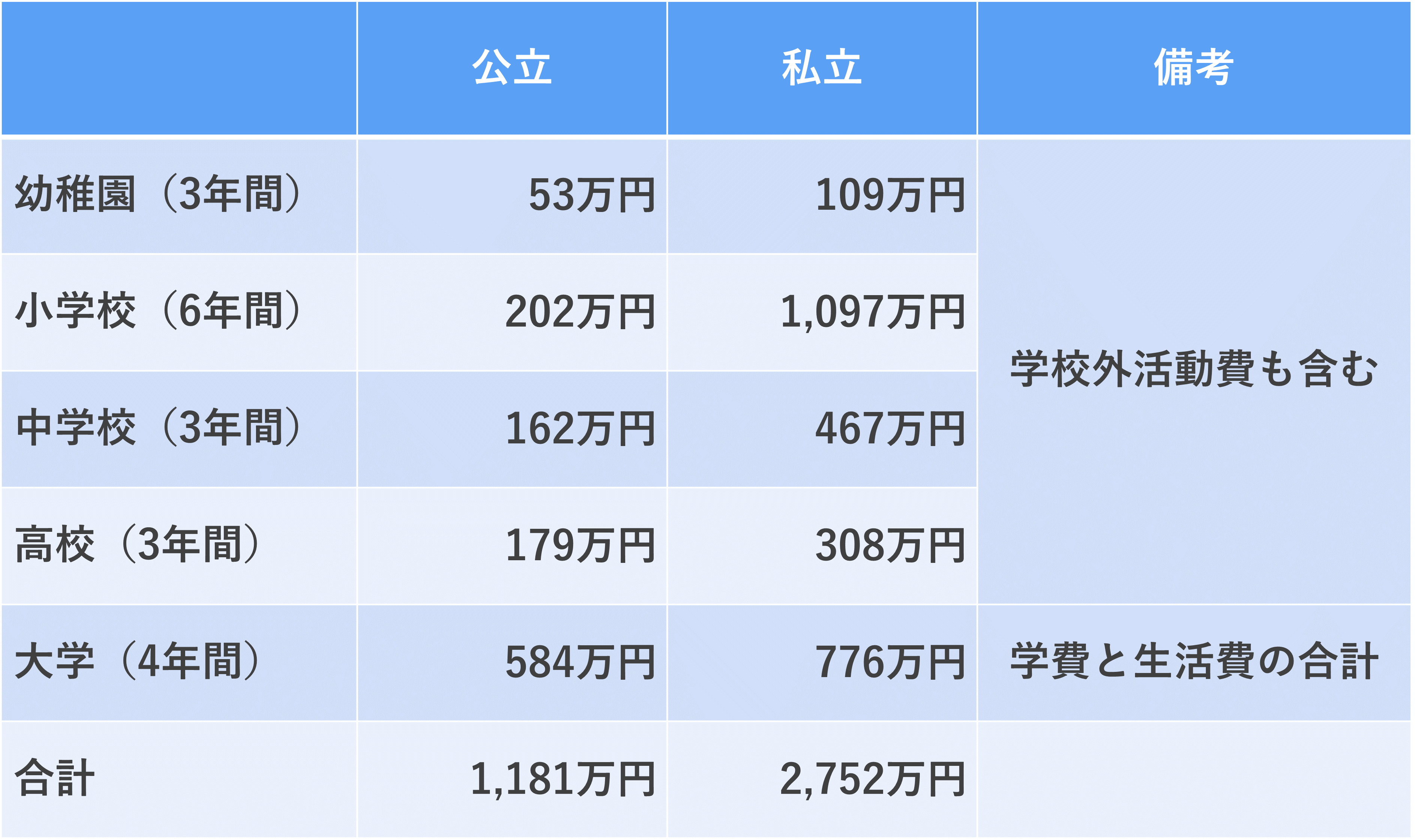 三大支出の2つ目は教育資金です。[図表5]に幼稚園に入園してから大学を卒業するまでに必要となる教育資金をまとめました。公立と私立で大きな差がありますが、大学を卒業するまでに1,000万円以上の資金が必要になることは確実です。
