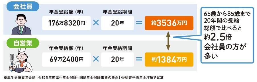 一方、会社員・公務員が加入する2階部分の厚生年金(老齢厚生年金)は、仕組みがやや複雑ですが、基本的に加入期間が長く給料や賞与が多いほど保険料は高く、その分受給額も高くなります。つまり、国民年金+厚生年金の2階分が受け取れる会社員・公務員の方が必然的に受給額も高くなります。2023年度の平均受給額は、国民年金は、年69万2,400円である一方、厚生年金は年176万8,320円でした。受け取れる額で比較すると、約2.5倍もの差が出る結果となります。