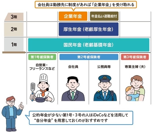 公的年金は1階部分に国民年金、2階部分に厚生年金、3階部分に企業年金と3階建てです。ただし、3階部分は公的年金ではなく私的年金の位置づけで、勤務先に制度がある場合のみ上乗せされます。また、1階建てか2階建てかは働き方によって異なるため、詳しく見ていきましょう。