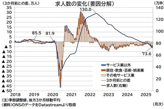 まず5月のデータとして公表されている求人数および給与所得者数を確認すると、求人数が25年3-5月の平均で73.6万件となった。4ヵ月連続の80万人割れで減少傾向が続いている(図表3)。なお、4月単月の求人数は72.0万件だった5。