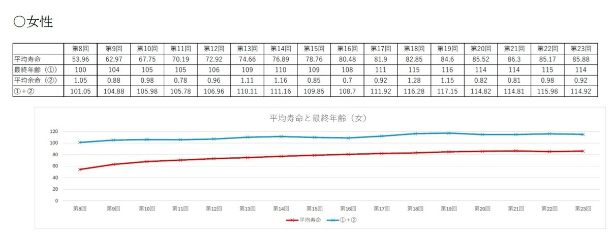 この表を見て、最終年齢も延び続けていると捉えるか、頭打ちになっていると捉えるかは、人による部分もあろうかと思うが、筆者には「(女性の平均寿命は第21回が最大であるものの)平均寿命は緩やかに伸び続け、一方最終年齢は頭打ち」という印象を受けた。上の生存数のグラフでいうと、やはり最終年齢の位置はほとんど動かず、台形が長方形に近づいていく(それによって平均寿命は緩やかに延びる)というイメージだ。