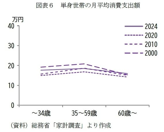 ところで、単身世帯が家計消費に占める割合(2020年では22.9%)は世帯数に占める割合(同38.0%)と比べて低いが、この理由は、(1)単身世帯は二人以上世帯と比べて世帯人員が少ないため世帯あたりの支出が小さいこと、(2)単身世帯では支出額が比較的大きい壮年世帯の占める割合が低いことによる。