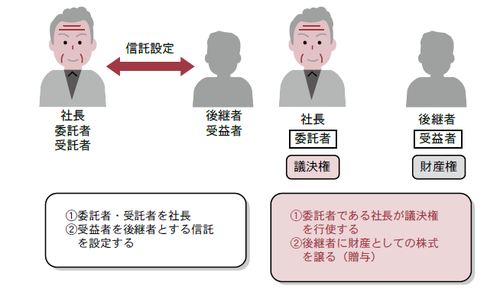 ③ 社長の議決権行使に制限がかかるようでは困るので、広範囲な議決権行使に同意したうえで、後継者への財産権(受益権)の贈与(相続時精算課税等)を行います。