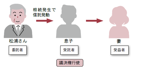もし、松浦さんに相続が発生すると、息子が議決権を行使し、妻が財産権を取得し、相続発生後の配当金を受領することができるようになります(毎年、収入を得ることが期待できます)。もし、妻が死亡した場合には、財産権を息子に移転させるとともに、信託を終了させる旨を定めておけば、妻が死亡後は、息子が全株式を取得することとなります。