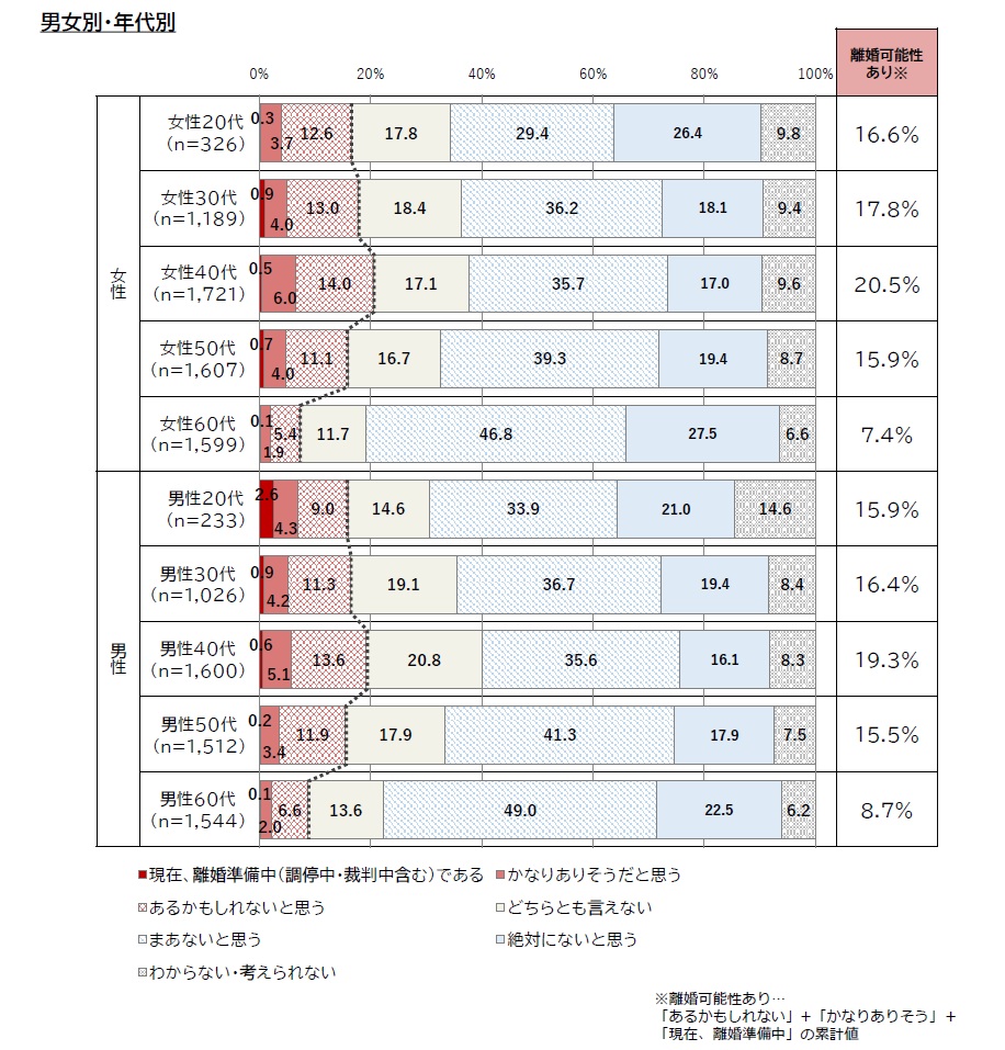 50代~60代の男女は、20代~30代に比べ【薄い青色(網かけ)】の「まあないと思う」と【青色】の「絶対にないと思う」の割合が高くなり、男女ともに60~70%以上の人は離婚する可能性が高くないと考えていることがわかります。