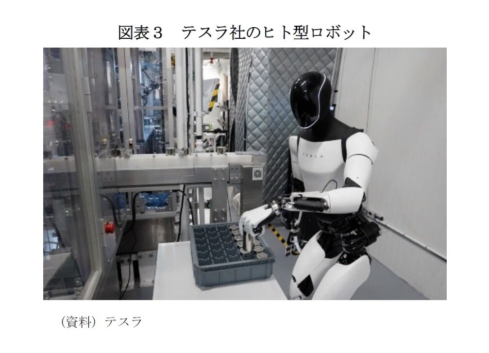 また、自動車産業をはじめとした製造業でもヒト型ロボットの導入が計画されている。米国の電気自動車大手テスラは自社工場へのヒト型ロボットの導入を計画している(図表3)*2。