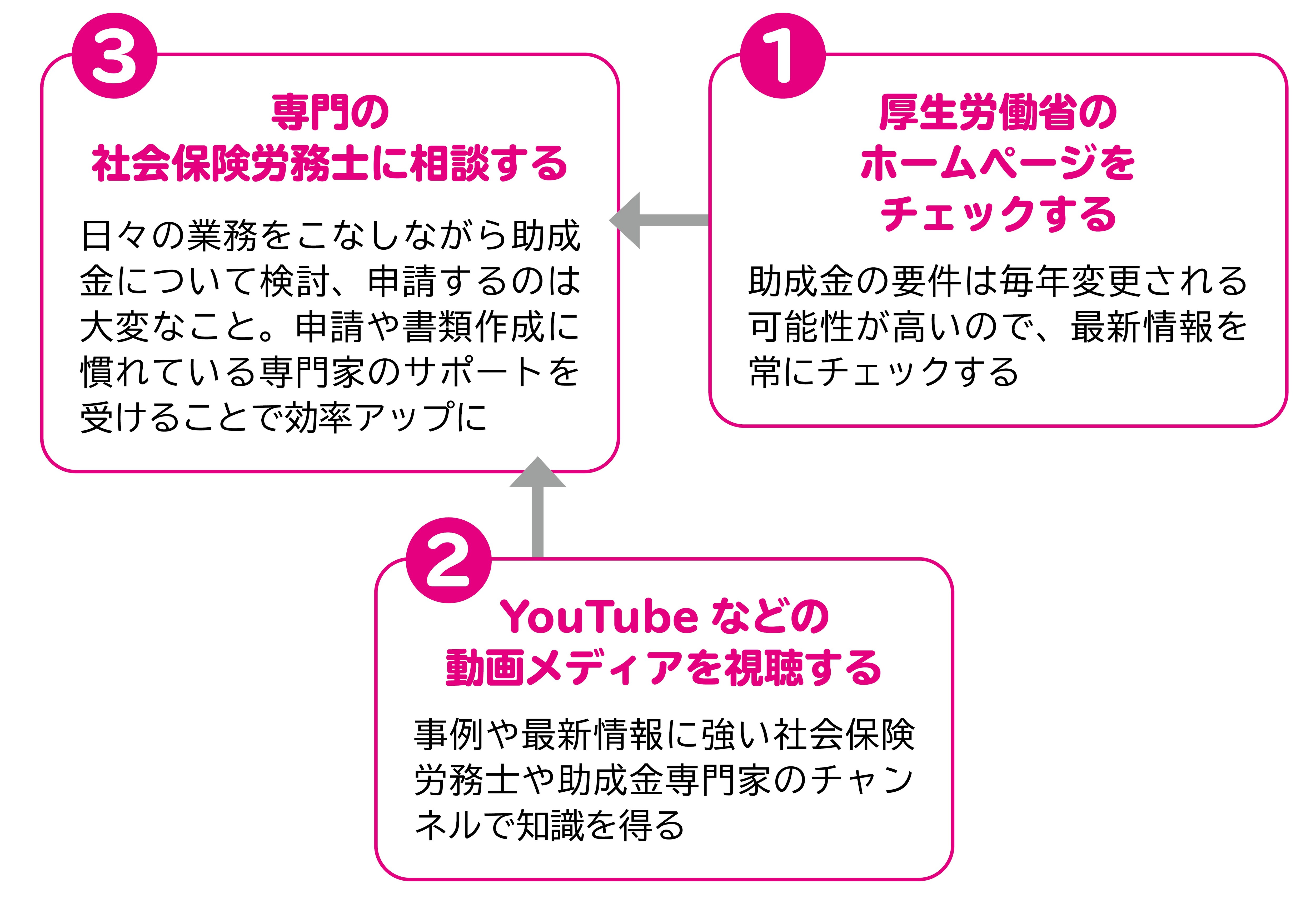 こうした中から自分の会社に最適なものを見つけるのは至難の業。助成金申請のための情報収集の方法として、以下をお勧めします。