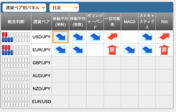 テクニカル指標を基に通貨ペアごとの売買シグナルを表示。