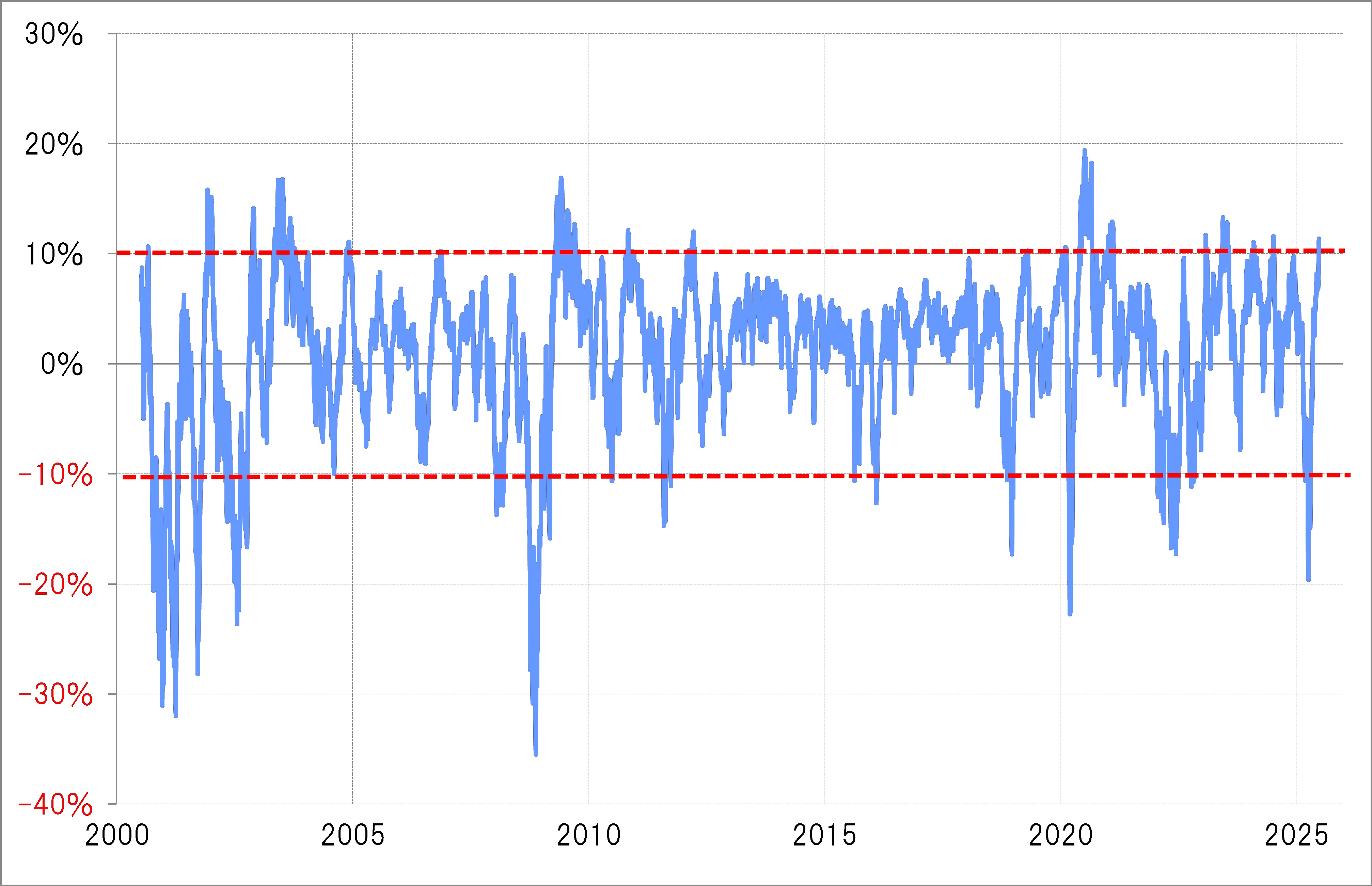 実は、ナスダック総合指数の90日MAかい離率は先週、10%以上に拡大しました。その意味では短期的な「上がり過ぎ」の懸念が強まっている可能性があります。そういったなかで、トランプ減税の議会成立となり米金利が上昇した場合は、それが「上がり過ぎ」修正のきっかけとなり米国株は下落に向かう可能性もあるのではないでしょうか。もしもそうなると、すでに見てきた政権1期目の「悪い金利上昇」と同じような構図となり、米ドル/円は下落に向かうことにならないでしょうか。