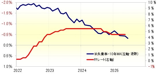 まず注目されるのは、米独立記念日の関係でいつもの金曜日ではなく、7月3日の木曜日に発表される米6月雇用統計です。雇用統計のなかの失業率は、米国の政策金利のFFレートと一定の相関関係があり、さらにその失業率から過去10年の失業率の平均値(10年MA)を引いた「修正失業率」にすると、相関関係はより高まります。そんな修正失業率は、6月の失業率が予想通り4.3%に上昇した場合は、0.25%以上のFFレート引き下げの必要を示唆することになります(図表4参照)。