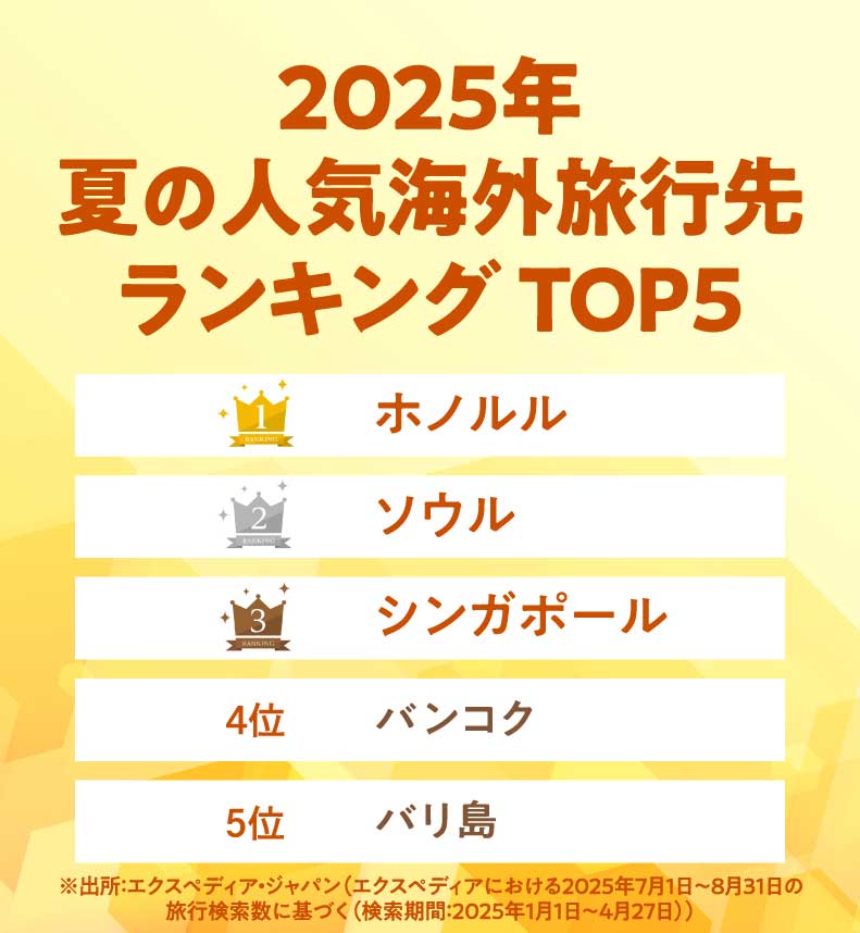 JTBの調査によると、今年の夏は日並びのよさやボーナスアップなどを背景に、旅行意欲が堅調。「今年の夏はどこへ行こう?」とワクワクしている人も多いのではないでしょうか。そこで今回は、世界32ヵ国でサイトを運営するオンライン旅行会社エクスペディアの調査結果をもとに、2025年夏の人気海外旅行先ランキングTOP5を紹介します。