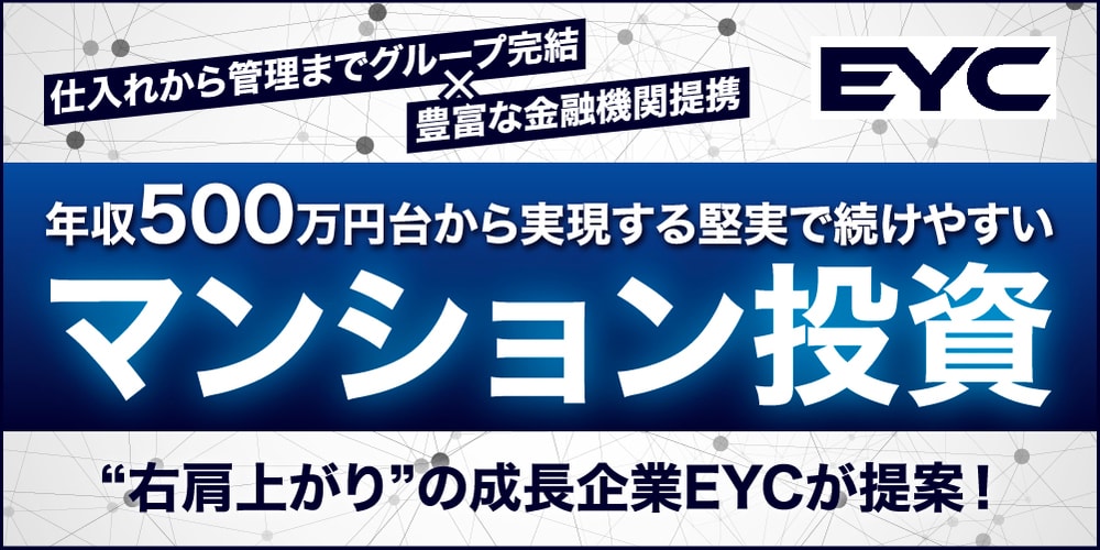 EYCは東京、大阪を中心に、自社グループにて、仕入れ・企画・設計から施工・管理までを一貫提供する区分所有マンション投資の専門企業です。自社ブランド「リヴィアス」シリーズを中心に、2,000万円台から販売。提携金融機関も多く、年収500万円以上の方から資産が作れます。契約後も、資産の組み換え提案や確定申告サポートなど、きめ細かなフォローを行い、投資を安心・身近にする体制を整えています。