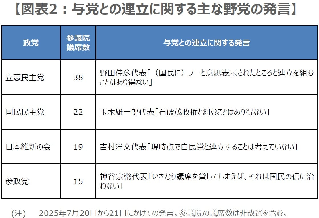 今後、与党が連立拡大を模索することも想定されますが、立憲民主、日本維新の会、そして国民民主、参政とも、現時点では与党との連立に否定的な考えを示しています(図表2)。市場はこの先、与党の政権運営や政策方針(野党公約の消費税減税などの扱い)を見極めることになると思われ、それらが財政悪化懸念を和らげるか、さらに強めるかによって、金利、為替、株価の方向性は大きく異なると推測されます。