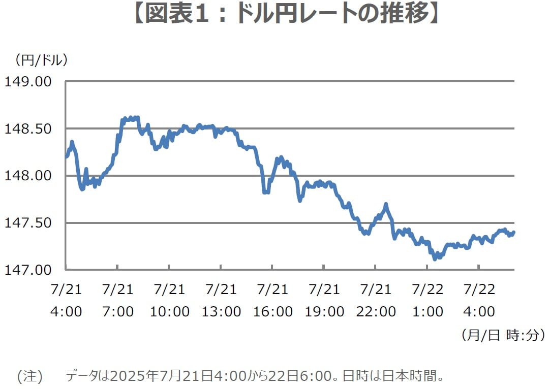 週明け7月21日の外国為替市場において、ドル円はドル安・円高で反応しました(図表1)。参院選前にドル高・円安が進んでいたこともあり、選挙結果がおおむね想定内となったことや、石破首相の続投が確認されたことで、いったん投機筋などの持ち高調整が進んだとも考えられます。また、大阪取引所の日経225先物は、39,000円台後半で方向感なく揉み合う展開となりました。