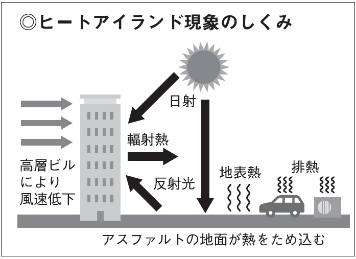 土の地面は土壌に水分を含み、気化熱で周囲の熱を下げる働きがある。しかし都市化で地面がアスファルトに覆われると、逆に熱を蓄積して周辺の気温を上げてしまう。建築物に備えつけられたエアコンの室外機や自動車からも大量の熱が排出され、気温上昇は加速する。