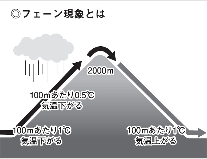 この空気が雲をつくって雨を降らすと、空気から水分が失われて乾燥していく。乾燥した空気はやがて山を降りていくが、今度は100メートルごとに1度、温度が上がっていく。元の気温低下が緩やかだったので、上昇前より暖かくなるわけだ。この結果、空気が下降した山麓エリアに、異常な高温がもたらされる。
