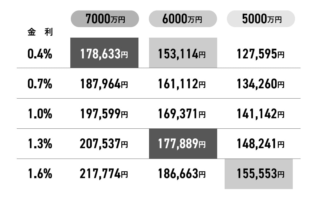 価格7,000万円で金利0.4%のケースと、価格6,000万円で金利1.3%のケースで支払う返済額が同額に近くなります。価格6,000万円で金利0.4%のケースと、価格5,000万円で金利1.6%のケースもそうです。