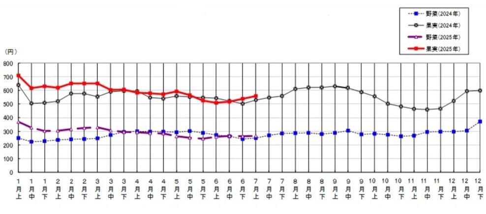 野菜・果実の卸値動向…6月下旬、7月上旬に前年比プラスへ転じる