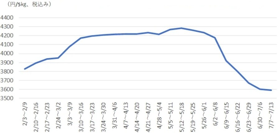 注目されているのはコメの価格動向です。農林水産省は7月22日に、全国のスーパーで7月7日~13日に販売されたコメ5kgの全POSデータ平均での販売価格が前週比▲13円安くなり、3,589円になったと発表しました。
