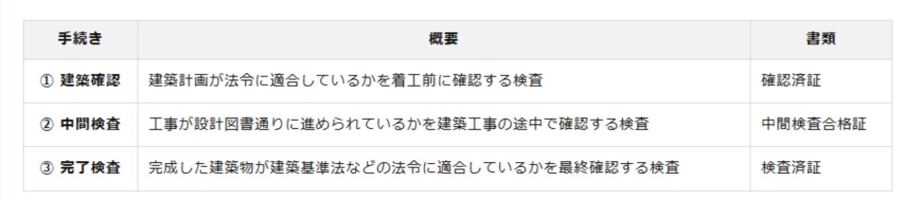 検査手続きには「建築確認」「中間検査」「完了検査」の3種類があり、それぞれに対応する書類も異なります。