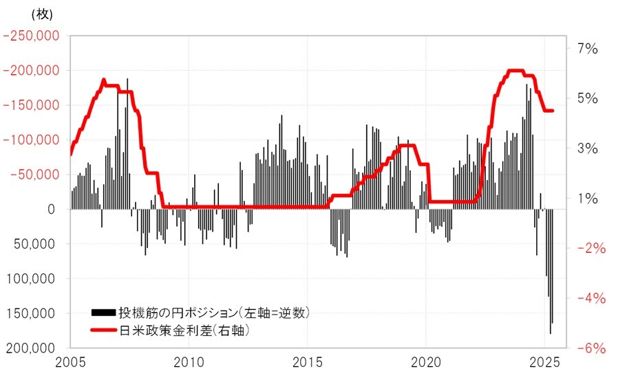 ところで、このようなヘッジファンドの円買いポジションは、一時より縮小したものの、まだまだ絶対的には大幅な金利差の円劣位から見ると不合理なものでしょう(図表5参照)。