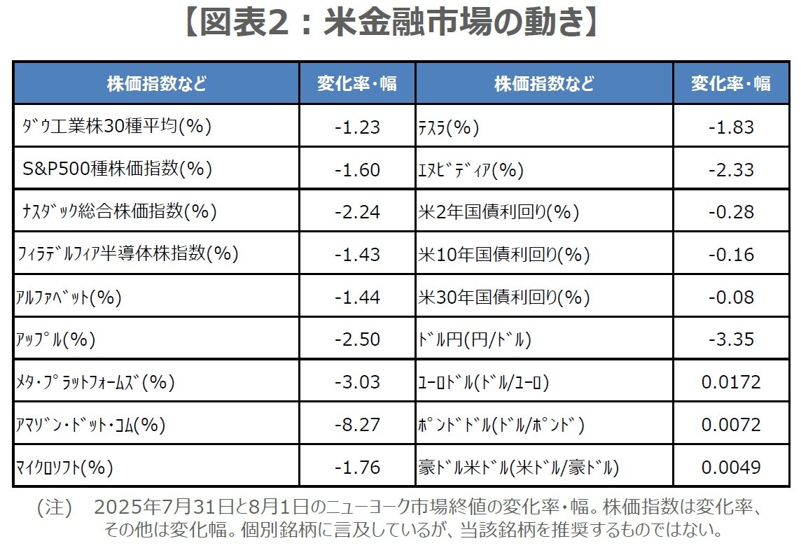 これを受け、同日の米金融市場では米経済の先行き懸念が強まり、ダウ工業株30種平均などの主要株価指数が下落、大型ハイテク株も軒並み値を下げる展開となりました(図表2)。フェデラルファンド(FF)金利先物市場では、9月の利下げ確率が上昇し、米国債利回りは2年から30年の各期間でそろって低下、米ドルが対主要通貨で減価するなか、ドル円は一時1ドル=147円30銭水準までドル安・円高が進行しました。