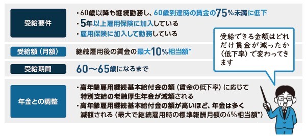 定年退職後も継続雇用や転職して働き続ける場合、一般的には賃金がダウンしてしまうケースが多いですが、それを補填する制度が「高年齢雇用継続給付」です。60歳以降の賃金月額が60歳到達時点に比べて75%未満の場合、一定の条件を満たせば雇用保険から賃金月額の最大10%*を「高年齢雇用継続基本給付金」として受け取れます。