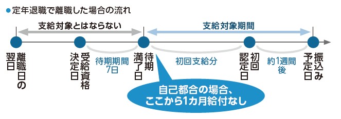 定年退職は自己都合でも会社都合でもなく、失業給付の給付日数は一般の離職者と同様ですが、図表4のような流れで失業給付の振込みが行われます。