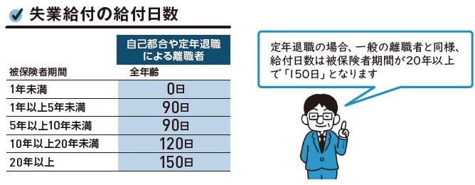 の3区分。定年退職での離職の場合、(1)の給付日数が適用され、給付制限なしで受給が始まります(自己都合の離職者は待期期間終了後に1ヵ月の給付制限がある。下記参照)。