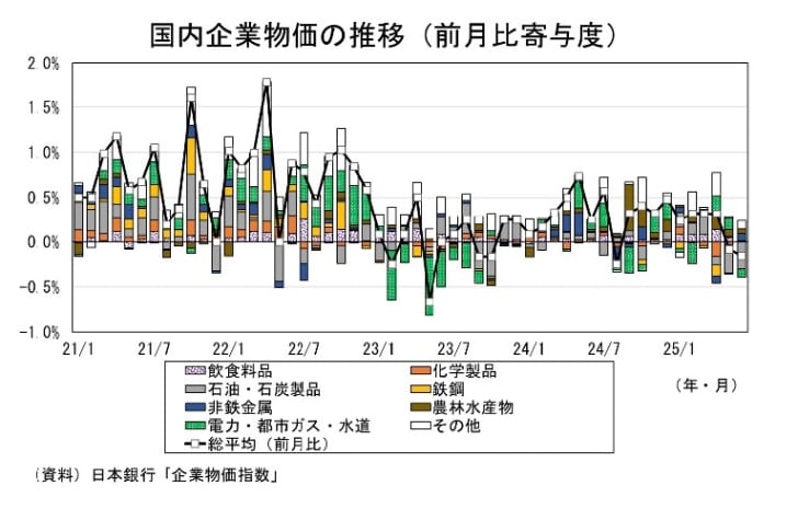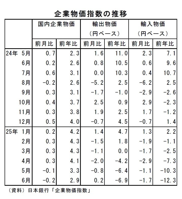 日本銀行が7月10日に発表した企業物価指数によると、2025年6月の国内企業物価は、前年比2.9%(5月:同3.3%)と、10ヵ月ぶりに2%台へと鈍化した。