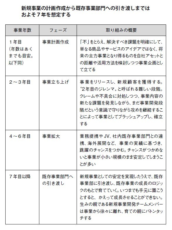 この2年目から3年目の段階で直面するのは、新規事業であるがゆえの不具合とクレームの発生です。これに丁寧に応え、不具合を修復しながら事業としての完成度を上げていきます。新規事業開発の指南書は、事業を構想して市場に投入するところがゴールとなっているものが多いのですが、本当に新規事業が育つかどうかは、市場に投入したあとの対応次第であり、ここが最も重要なフェーズといっても過言ではありません。