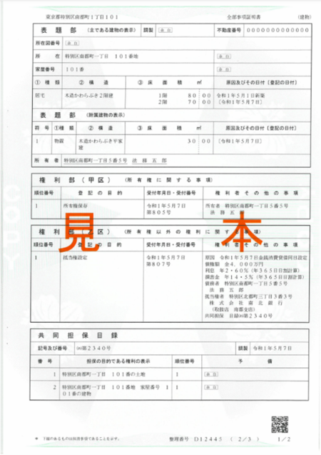 見本の登記事項証明書の場合、不動産の所有権は法務五郎さんにあります。また、不動産には住宅ローンを理由として抵当権が設定されており、抵当権者は株式会社南北銀行であることがわかります。