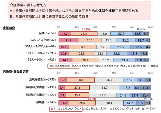 介護休業を「介護に専念するための休暇」と認識している方は少なくありませんが、本来介護休業は「介護の計画を立てるための制度」との位置づけです。厚生労働省の資料によると、介護休業期間は「主に仕事を続けながら介護をするための体制を構築する期間である」との認識を持つ企業・従業員の割合は約4割で、「介護休業期間は介護に専念するための期間である」との認識を持つ企業は約35%を占めています。