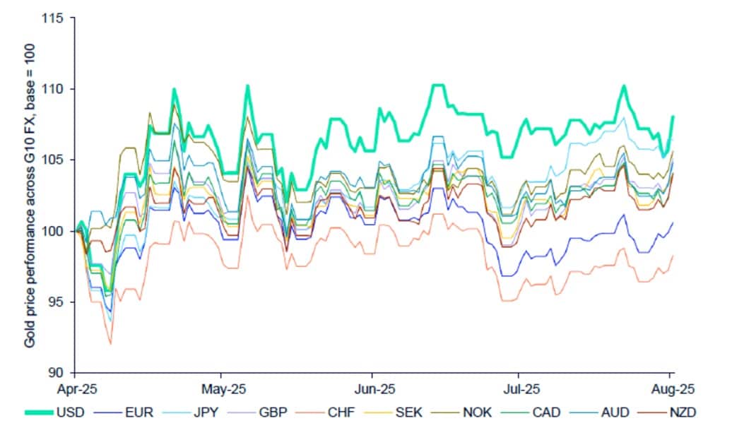 米国が関税政策を発表した4月の「解放の日」以降、金相場の米ドル建てパフォーマンスは、他のG10通貨建てを上回っています。しかし、一方的な関税措置は米ドルにとってマイナス要因と広く見られており、米ドルは7月初旬に年初来安値を更新しました※1。そのため、デノミネーション(通貨価値の低下)効果を通じて金価格が上昇しています。
