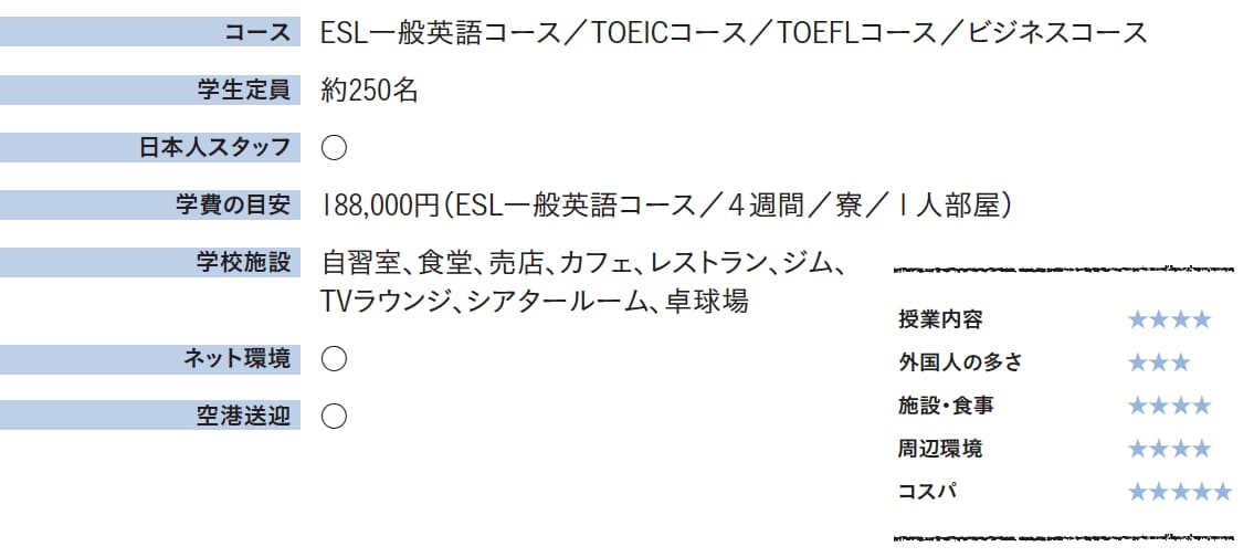 私は「ESL コース」を選択したので対象ではなかったのですが、TOEIC と TOEFL コースそれぞれに「点数保証」の制度を設けており、目標の点数を獲得するまで、追加授業と本試験を追加料金なしで受けられます。この制度適用のためには学校で決められた入学日から12週間留学する必要があります。
