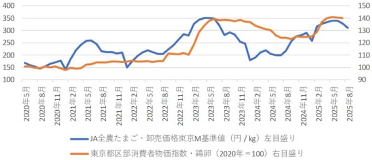 25年8月のJA全農たまご・卸売価格東京M基準値は、1日~22日までの平均値は310円/kgと、最近の極大値だった5月・6月の340円/kgをピークに、7月の328円/kgに続き2ヵ月連続で低下しています。2月以降7ヵ月連続300円/kg台と高水準ですが、最近の落ち着いた動きも、8月の消費者マインドアンケート調査に通じるところがあるとみられます。