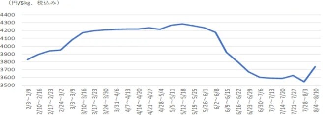 農林水産省は8月18日、全国のスーパーで8月4日~10日に販売されたコメ5kgの全POSデータ平均での販売価格が前週比+195円と2週ぶりに上昇し、3,737円になったと発表しました。9週連続で3,000円台です。前年同期比をみると+43.9%と依然高水準ですが、コメの値段が前年比ほぼ倍になっていたところからはかなり落ち着いてきました。