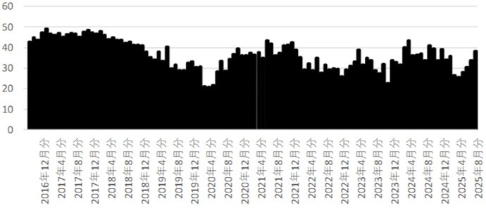 22年10月に90.4をつけたあと80台後半の高水準での推移が続き、23年は6月に90.7をつけました。そこから振幅をともないつつ24年9月の80.3まで一旦低下しましたが、反転上昇傾向になり、25年2月に90.2と20ヵ月ぶりの90台を記録しました。