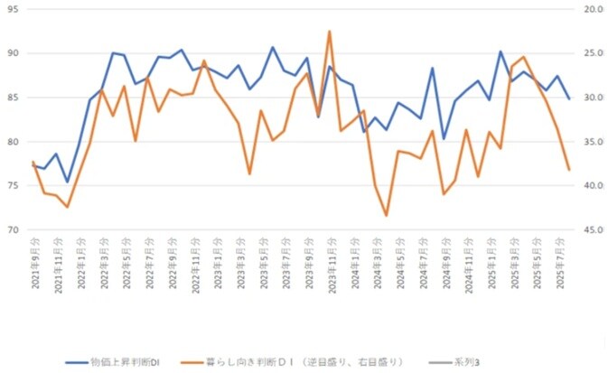 24年10月から25年8月までの11ヵ月間は、物価上昇判断DIが84以上の高水準に上昇でした。暮らし向き判断DIは、20台・30台の低水準である状況には変わりはなく、物価見通し判断が暮らし向き判断の足枷になる状況が継続していましたが、25年8月では若干の変化がみられます。物価見通し判断は依然高めなもののやや鈍化傾向で、暮らし向き判断が改善傾向にあります。