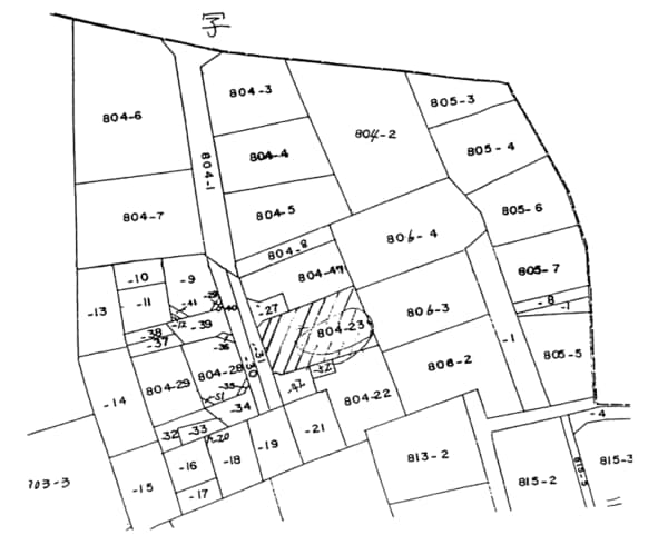 804番23の調査のため公図を徴求しました。市役所と現地及び登記所で804番23の接面道路を調査したところ、次のようなことがわかりました。