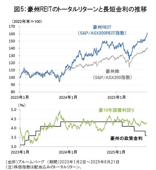 特に足元では、RBAによる利下げや個人消費の回復、住宅取引の活性化などを背景に、豪州REITのパフォーマンス改善も顕著となっています(図5)。2026年に向けては、RBAの利下げ継続が見込まれており、豪州REITに対する投資家の再評価が進む可能性がありそうです。