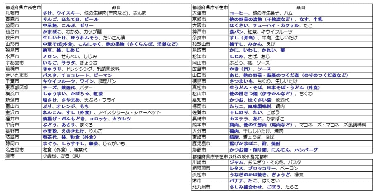 一覧表に記載されている食料の購入品目が10年前と変わらない都市もある一方で、変わっている都市もあります。