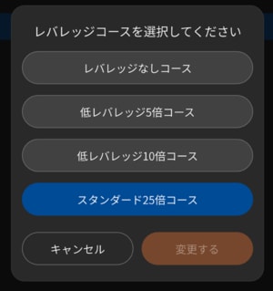 レバレッジは最大25倍までですが、初心者が過大なリスクを避けるためにレバレッジ倍率とロスカット率を選択することができます。